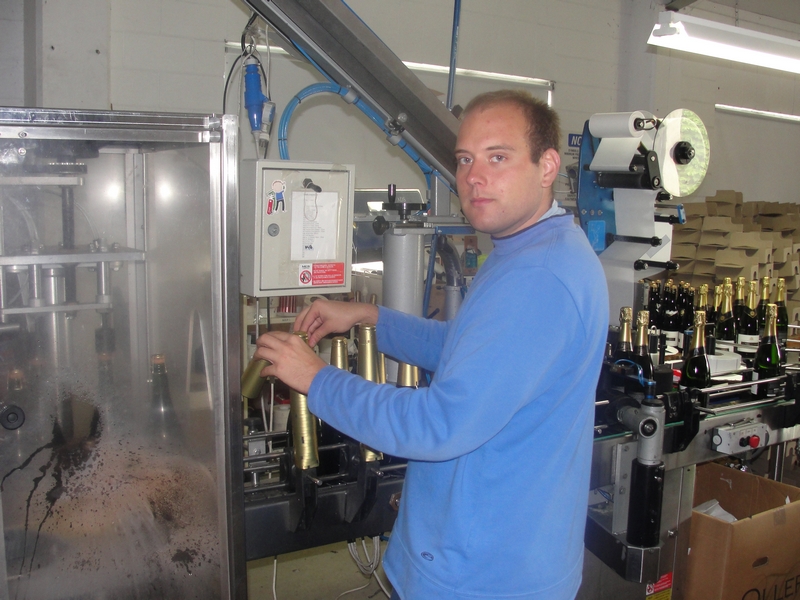 še kovinski navoj, tako da ogljikov dioksid pri transportu steklenice do prodajnih polic ne potisne ven tudi plutovinastega zamaška. Zatem se steklenice fizično močno pretrese, s čimer se aditivi popolnoma zmešajo med seboj. Steklenice se položijo nazaj v lesene zabojnike, kjer se jih nekaj časa pusti, da se zopet segrejejo na normalno temperaturo. V zadnji fazi se steklenice iz lesenih zabojnikov zopet položi na tekoči trak, kjer se najprej temeljito operejo od vrha do dna, nato pa se na njih nanese sprednjo, zadnjo, ter pri nekaterih tudi vratno nalepko. Prav tako se na vrh steklenice namesti papirnat pokrovček, ki se vakumsko stisne, s čimer da steklenici prestižnejši izgled. Na koncu se steklenice še napolni v kartonaste škatle, škatle položi na paleto in povije s folijo, s čimer so pripravljene za transport po trgovinah celega sveta.Večino naše delovne dobe smo vsi trije preživeli na istih delovnih mestih. Rok je prelagal steklenice iz kovinskih kletk v zamrzovalno tekočino, Jaka je steklenice tresel, tako