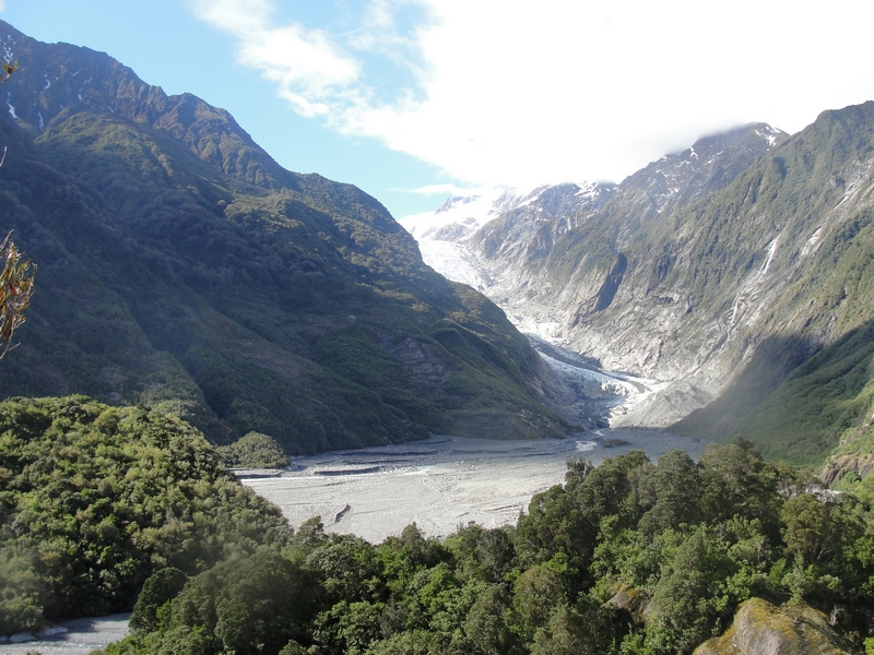 Do končne postaje tega dneva nam je ostalo zgolj nekaj kilometrov in ker nismo vnaprej vedeli kakšna bo situacija s prenočišči in parkirišči v Franz Josef Glacier smo se ustavili na prvi večji urejeni obcestni površini in prvič prenočili kar v avtu. Prvič in zadnjič, saj se je v tem momentu (in vseh nadaljnjih do jutra) v vsej gloriji pokazala velika neudobnost našega premajhnega Kriwija. Dve osebi sva spali na sprednjih sedežih, ki jih seveda ni bilo možno spraviti v povsem horizontalno lego, saj je na zadnjih sedežih spala še tretja oseba, ki je prav tako negodovala nad neudobjem premajhnega prostora za noge, ko sva spredaj najine sedeže potisnila povsem nazaj, ter se vsaj nekoliko razkomotila. Ker smo spali bolj slabo, smo že dokaj rano zjutraj odhiteli na bližnji ledenik, ki je nosil ime spodaj ležečega mesta – oz. obratno. Zopet je bila to prava paša za oči, saj zase vem, da v poletnem času pred tem še nisem videl tako mogočnega ledenika. Dodatna zanimivost je v tem, da se ledenik nahaja le nekaj 10km od obale in se razprostira na relativno nizki nadmorski višini, vendar so zavetje okoliških gora, lokalna mikroklima in obsežna količina padavin povzročili, da je to eden izmed redkih svetovnih ledenikov, ki se celo povečujejo. Samo nekaj kilometrov po cesti naprej se nahaja podoben fenomen z imenom Fox Glacier, ki pa se zaradi časovne prenatrpanosti ni uvrstil na naš ožji seznam želja in posledično na naš urnik.