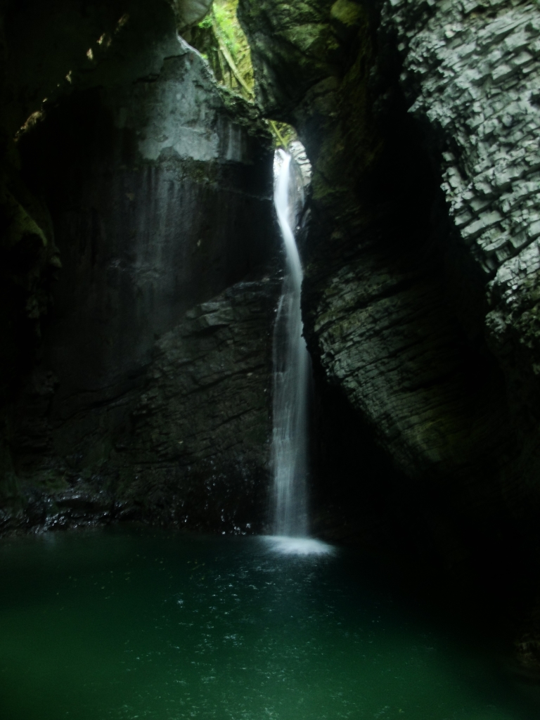 dolga pot. Najprej pa postanek in polurni sprehod do slapu Kozjak, enega največjih draguljev naše deželice. Tako kot sem opisoval že v prejšnjem poglavju je bila dolina Soče lepa že od samega začetka (oziroma konca), toda najlepši del me je šele čakal. Dolina, ki jo je že pred davnimi stoletji izrezala Soča je res edinstvena in vredna občudovanja. Prvič da sem med kolesarjenjem naredil malo daljši sprehod. Občasno sem se v svojih kolesarskih čevljih počutil kar neudobno, saj sem velikokrat s spodnjo jekleno ploščico nehote zadel ob kakšen malo večji kamen ali skalo, pri čemer me je kar nekoliko zabolelo pri srcu. Vendar rezervne obutve nisem imel, tako da tudi nisem imel veliko izbire, če sem hotel videti še kaj več od same ceste in njene neposredne okolice. Vsekakor sem moral mimoidočim turistom delovati precej komično, saj sem se sprehajal v popolni kolesarski bojni opremi, vključno s čelado na glavi – no nekje sredi poti sem se jo celo spomnil sneti z glave – in popotniškim nahrbtnikom na ramenih. Pred zadnjim vzponom do slapu je bilo kar precej gneče, tako da sem na svojih 5 minut in dobro fotografijo moral tudi malce počakati in ko sem ga končno ugledal se mi je zdelo kar prehitro, da sem se moral že vrniti. Pred mano je bila vendarle še zelo dolga pot.
